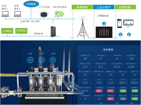 1、用户使用物联网模块,每个泵房配置一到两个,通过串口与现场PLC设备连接,获取运行数据和传感器信息。